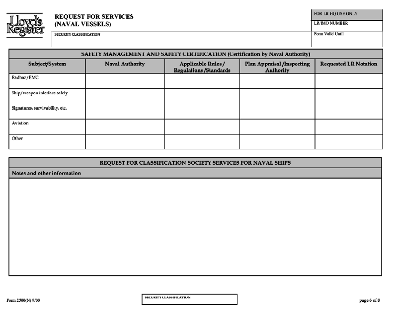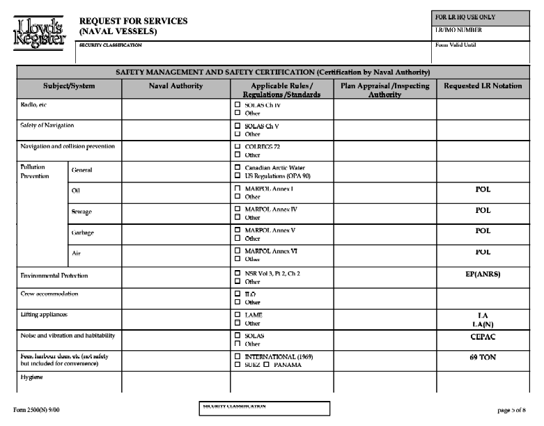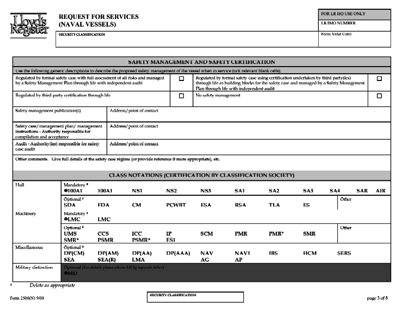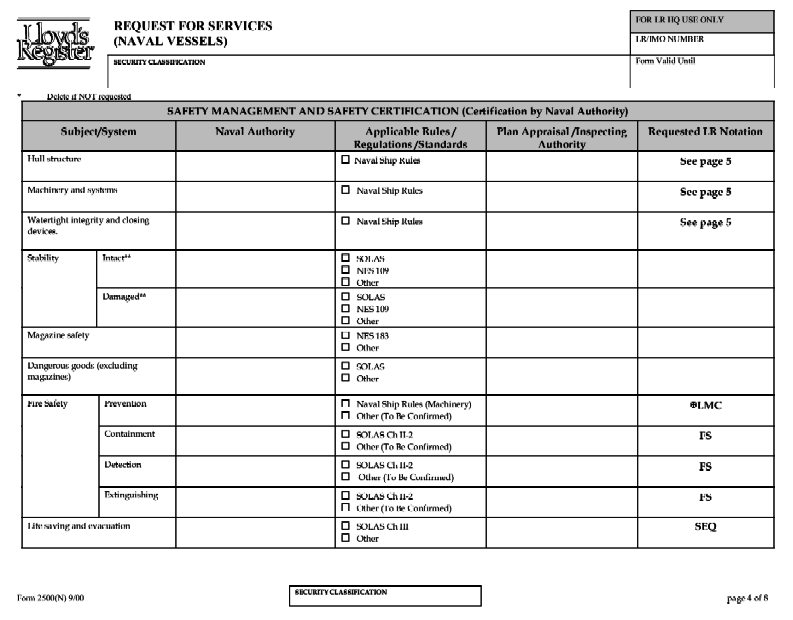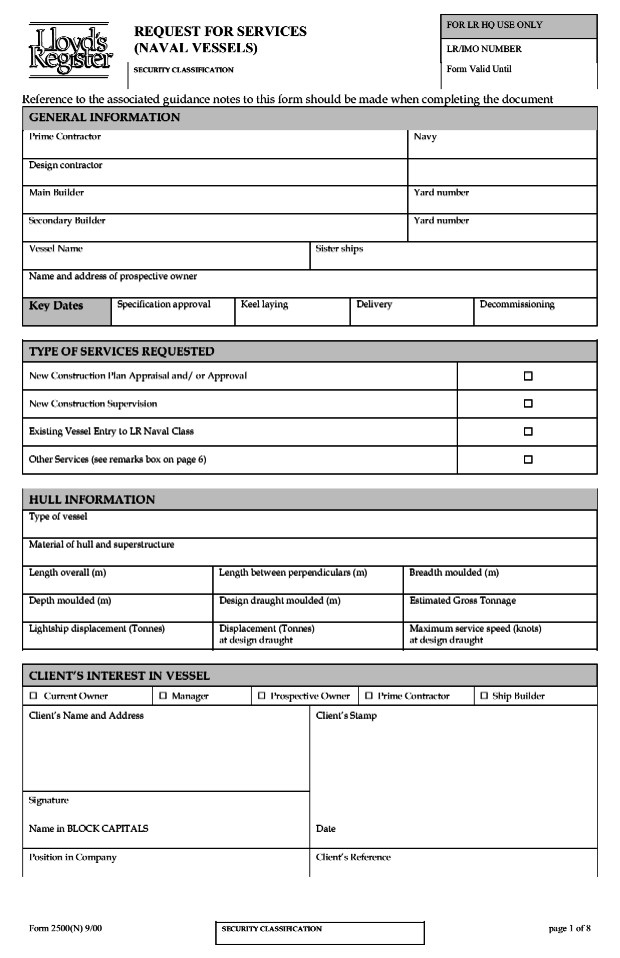 Clasifications Register Guidance Information - Naval Survey Guidance for Steel Ships, January 2001 - Chapter 20 Appendix 1 Request for Services (Naval Vessels) - Section 1 Request for Services (Naval Vessels)