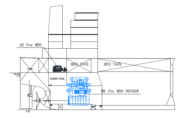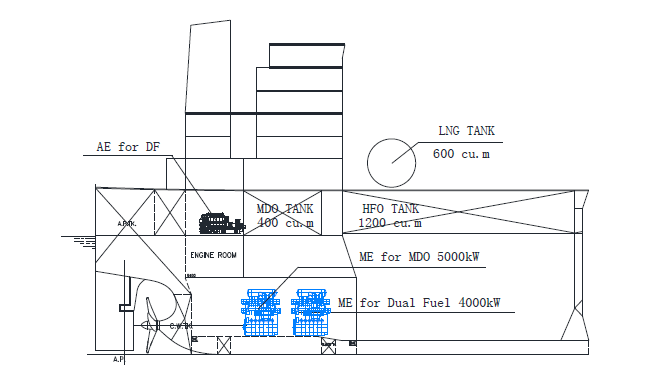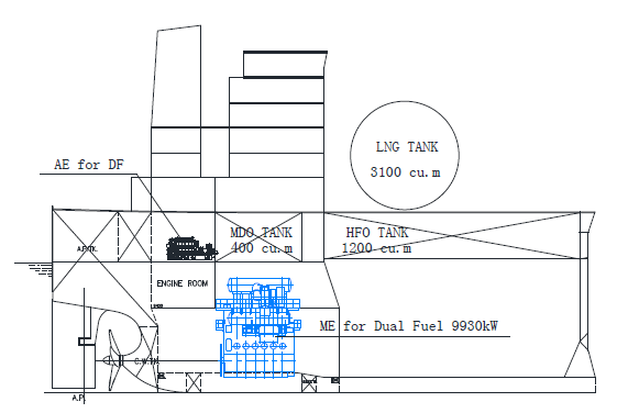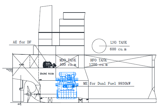 dual-fuel auxiliary engine (LNG, pilot fuel MDO, no shaft generator) which LNG could not