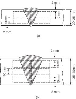thickness, the other 20–25 mm, as shown in Figure 11.7.1 Butt weld test assembly and specimens for all techniques, noting that in the thinner