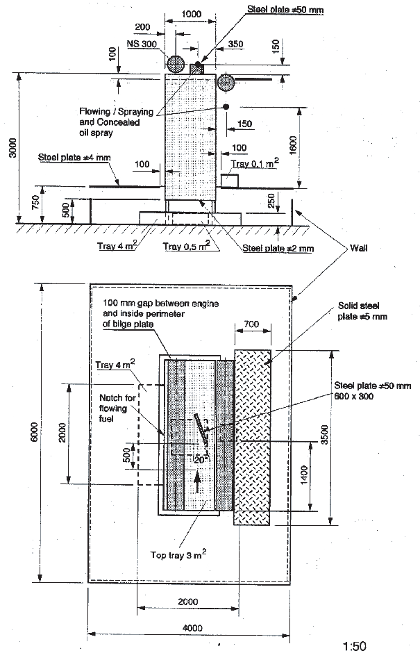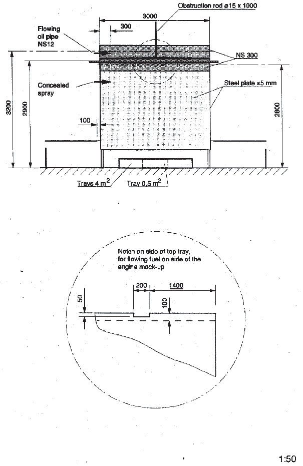 and fires in trays under (4 m²) and on top of the simulated engine (3