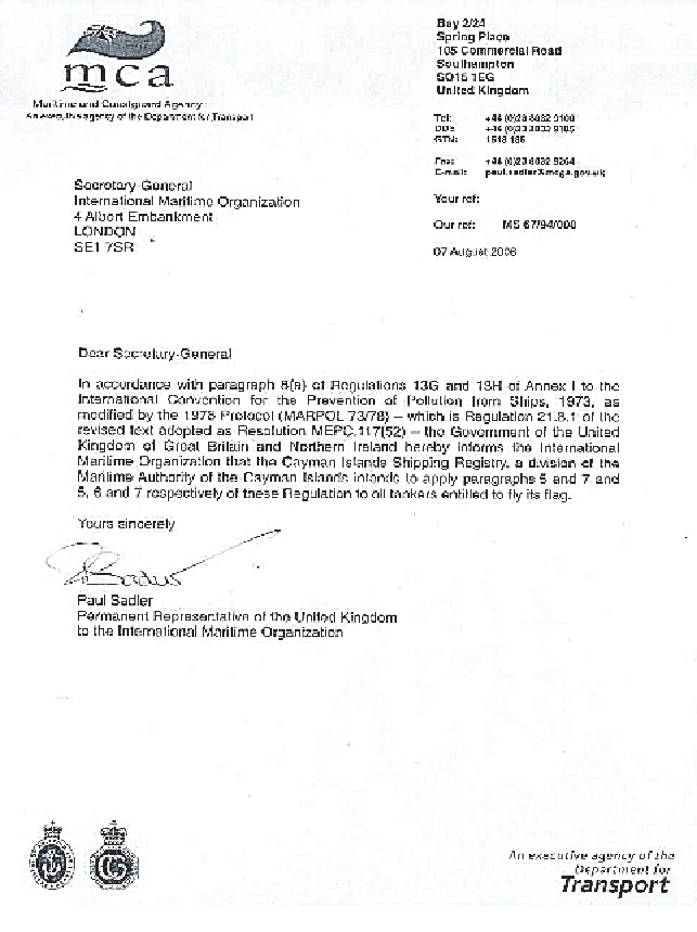 Statutory Documents - IMO Publications and Documents - Circulars - Marine Environment Protection Committee - MEPC.1/Circular.531 – Implementation of the Revised Regulation 13G and Regulation 13H of MARPOL Annex I – (10 August 2006)Communication received from the Administration of the United Kingdom on behalf of the Maritime Authority of the Cayman Islands - Communication