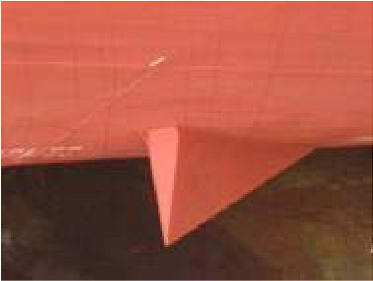 device such as a vortex generator, usually of elongated pyramid shape, to the hull