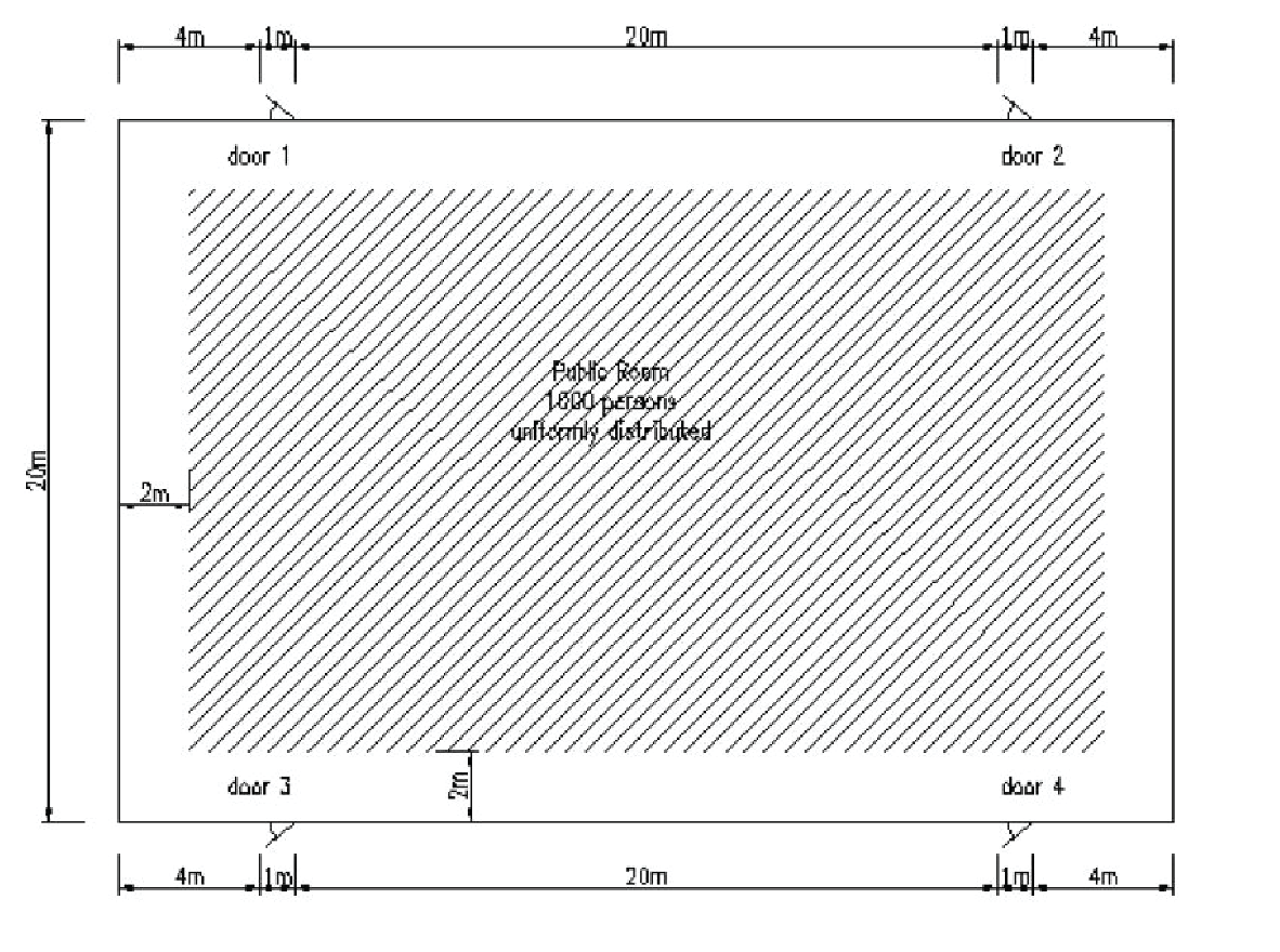 15 Public room with four exits and 1,000 persons (see figure 3) uniformly distributed