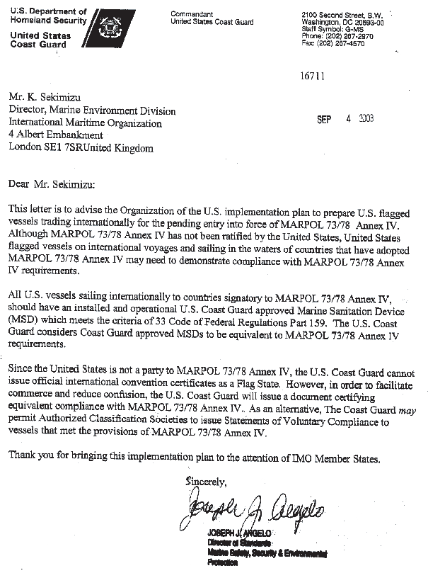 Statutory Documents - IMO Publications and Documents - Circulars - Marine Environment Protection Committee - MEPC/Circular.410 – Annex IV of MARPOL 73/78 - Communication received from the Administration of the United States – (22 September 2003) - Communication
