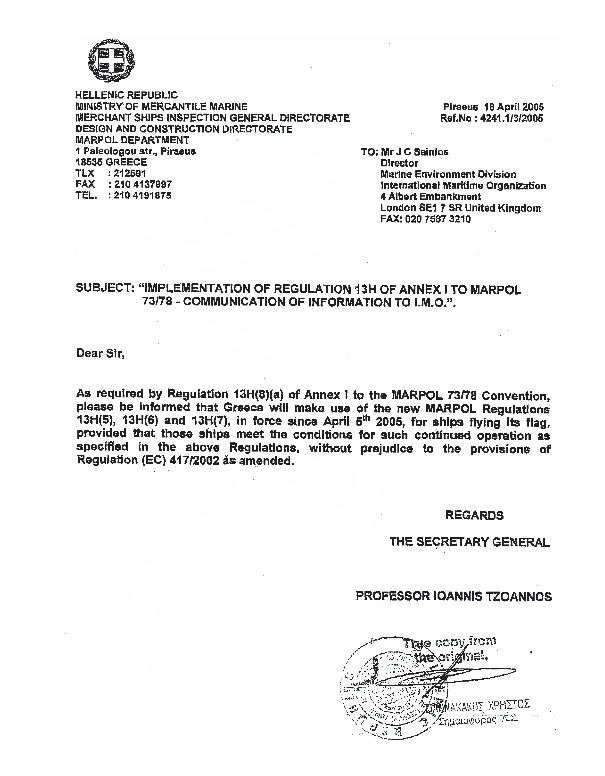 Statutory Documents - IMO Publications and Documents - Circulars - Marine Environment Protection Committee - MEPC/Circular.450 – Implementation of the Revised Regulation 13G and Regulation 13H of MARPOL Annex I – (20 May 2005)Communication received from the Administration of Greece - Communication