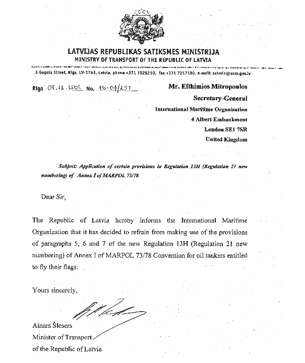 Statutory Documents - IMO Publications and Documents - Circulars - Marine Environment Protection Committee - MEPC.1/Circular.492 – Implementation of the Revised Regulation 13G and Regulation 13H of MARPOL Annex I – (21 December 2005)Communication received from the Administration of Latvia - Communication