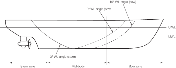 is to be interpreted using Figure 3.2.2 Interpretation of waterline angles for Stern First Ice Class Ships. The waterline length is to be divided into four sub-regions
