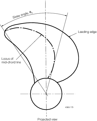1.3.1 The maximum skew angle of a propeller blade is defined as the angle, in projected view of the blade, between a line drawn through the blade tip and the shaft centreline and a second line through the shaft centreline which acts as a tangent to the locus of the mid-points of the helical blade sections, see Figure 1.1.1 Definition of skew angle.