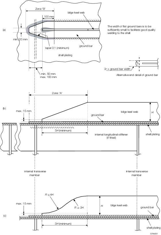keels are to be attached to a continuous ground bar as shown in Figure 3.1.8 Bilge keel construction. Butt welds in shell plating,